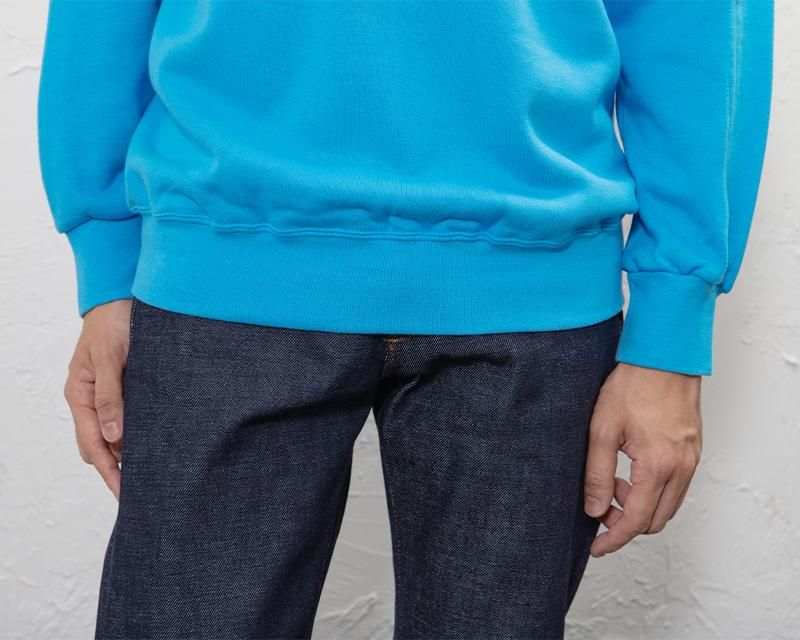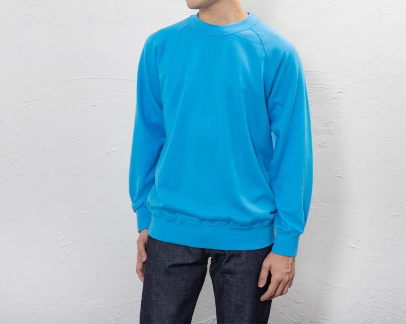 衿もとから脇下に切り返しを入れたラグランスリーブは身体のラインに自然にフィットしてとても動きやすく、ワークウエア・スポーツウエアとしても最適です。衿と袖口、裾部分には洗濯を重ねても伸びにくいスパン・フライスを使用しているので、永いご愛用にこたえます。しっかりと編み込んだ綿100%裏パイルの身生地は素肌に心地よく、裏起毛の様に洗濯して痩せる事がありません。適度な厚みを持ち、洗いこむ程に体になじんできます。