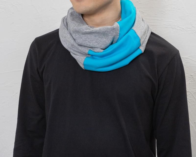 Tシャツ素材のスヌードに、ポケットつきのライトバーション登場,モデル:168cm 一重巻きで胸元にアクセントを,二重巻きで衿元を暖かく,Tシャツ生地ならではの、なめらかな肌あたり,ブランドラベル, モデル:171cm,ポイントカラーをずらしてアクセントに,くるりと丸めて付属のポケットにコンパクトに収納