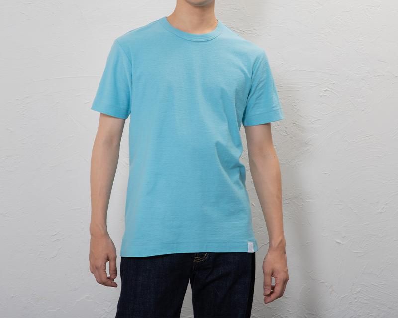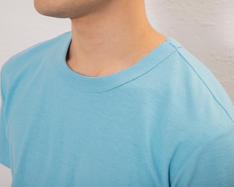 衿元、アームホールを程よく細目にしたすっきりとしたシルエット,サイズ:L / モデル:168cm,首元,サイズ:M / モデル:171cm,襟元アップ,裾部分,イメージカラーの水色のステッチと白のプリント