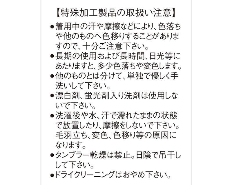 ※摩擦などにより、色落ちや他のものへ色移りすることがありますので、十分ご注意ください。※他のものとは分けて、単独で手洗いしてください。※洗濯後や水、汗で濡れたままの状態で放置したり、摩擦をしないでください。毛羽立ち、変色、色移り等の原因になります。※タンブラー乾燥禁止。日陰で吊干ししてください。※ドライクリーニングはおやめください。