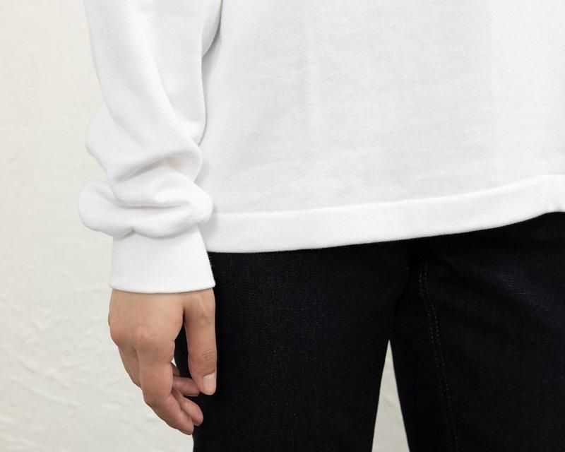 肌当たりの良いハイネックの衿と、洗いたてのタオルの様な裏パイル生地。裾をしぼらない身体の線を出さずにストンと落ちるシルエットで、すっぽり被り袖を通すとコットンパイルの心地よさに暖かく包まれます。良質な糸を厳選し、国内で丁寧に編み上げて染色した綿100%の裏パイル生地(本体部分)。素肌に心地よく、裏起毛のように洗濯して痩せにくいのも特長のひとつです。また適度な厚みを持ち、洗いこむ程に体になじんできます。