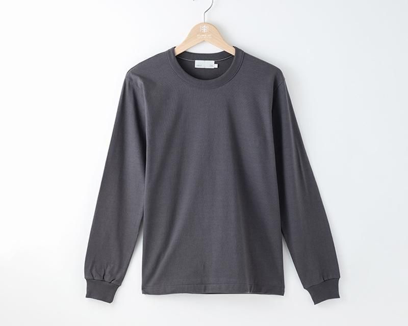 長年にわたって信頼関係を築いてきた国内でも有数の技術を持つ紡績会社、編み工場、染色工場との協業で仕上げられた新作のオリジナル生地。弊社のオリジンである莫大小(メリヤス)製造時代から培ってきた職人の技術やノウハウを活かしたディテール(丸胴仕立て・型紙・バインダーネック・閂止め・天地引き)を用いています。シンプルでクリーンな印象の衿は、型崩れしにくいバインダーネック仕様。裏地に凝ったといわれる江戸時代の洒落者のような遊び心から(着用すると見えない)衿裏のステッチ糸と、弊社のアイコニックなディテールである閂(かんぬき)止めの糸を配色(グレー)となっています。袖口は綿100%で肌触りの良いフライス編の生地を使用したリブ仕様で、腕まくりでアクセントを付ける着こなしも楽しめ、長いシーズン着られるヘビーウエイト・ロングスリーブTシャツです。