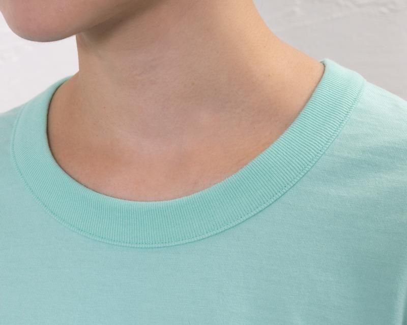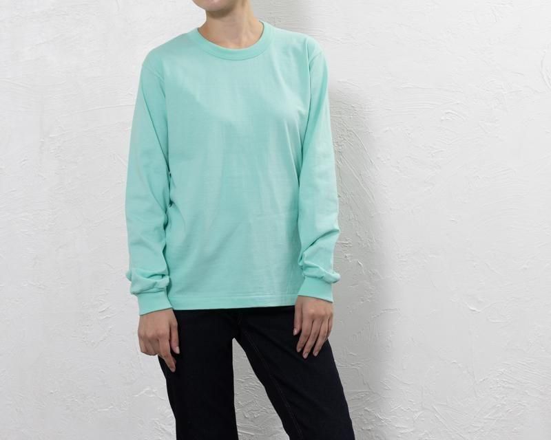 長年にわたって信頼関係を築いてきた国内でも有数の技術を持つ紡績会社、編み工場、染色工場との協業で仕上げられた新作のオリジナル生地。弊社のオリジンである莫大小(メリヤス)製造時代から培ってきた職人の技術やノウハウを活かしたディテール(丸胴仕立て・型紙・バインダーネック・閂止め・天地引き)を用いています。シンプルでクリーンな印象の衿は、型崩れしにくいバインダーネック仕様。裏地に凝ったといわれる江戸時代の洒落者のような遊び心から(着用すると見えない)衿裏のステッチ糸と、弊社のアイコニックなディテールである閂(かんぬき)止めの糸を配色(グレー)となっています。袖口は綿100%で肌触りの良いフライス編の生地を使用したリブ仕様で、腕まくりでアクセントを付ける着こなしも楽しめ、長いシーズン着られるヘビーウエイト・ロングスリーブTシャツです。