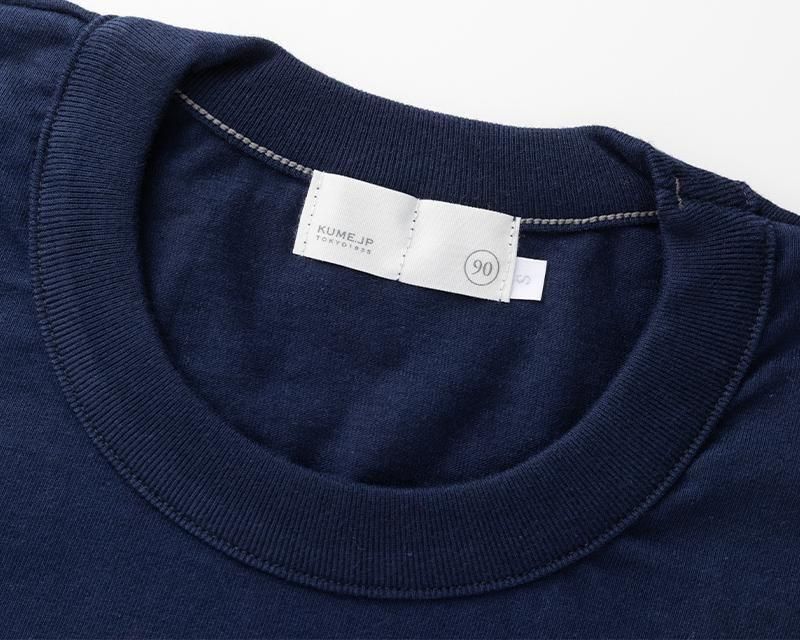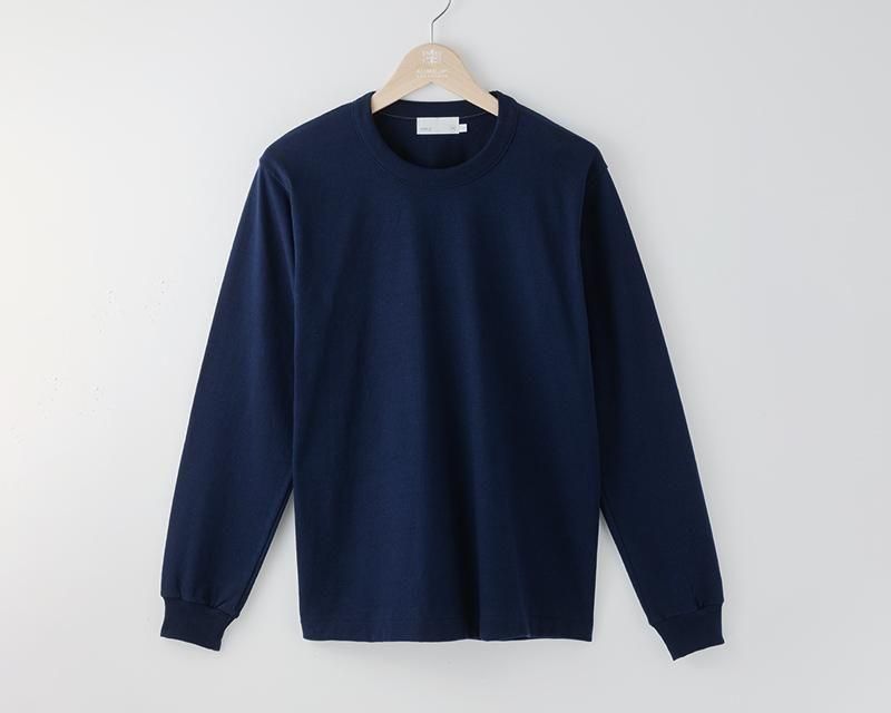 長年にわたって信頼関係を築いてきた国内でも有数の技術を持つ紡績会社、編み工場、染色工場との協業で仕上げられた新作のオリジナル生地。弊社のオリジンである莫大小(メリヤス)製造時代から培ってきた職人の技術やノウハウを活かしたディテール(丸胴仕立て・型紙・バインダーネック・閂止め・天地引き)を用いています。シンプルでクリーンな印象の衿は、型崩れしにくいバインダーネック仕様。裏地に凝ったといわれる江戸時代の洒落者のような遊び心から(着用すると見えない)衿裏のステッチ糸と、弊社のアイコニックなディテールである閂(かんぬき)止めの糸を配色(グレー)となっています。袖口は綿100%で肌触りの良いフライス編の生地を使用したリブ仕様で、腕まくりでアクセントを付ける着こなしも楽しめ、長いシーズン着られるヘビーウエイト・ロングスリーブTシャツです。